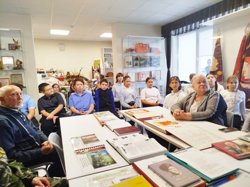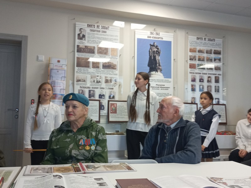 Юные музееведы Иванова Анна, Филимонова Варвара, Шакирова Анастасия и Овчинникова Анна провели экскурсию «Солдатская слава». С особым интересом ребята слушали воспоминания ветеранов. Общий мотив встречи – необходимость изучать, знать, не забывать свои корни, чтить защитников Отечества. Память о защитниках Отечества живет в наших сердцах. Пока мы помним своих героев - жива Россия!