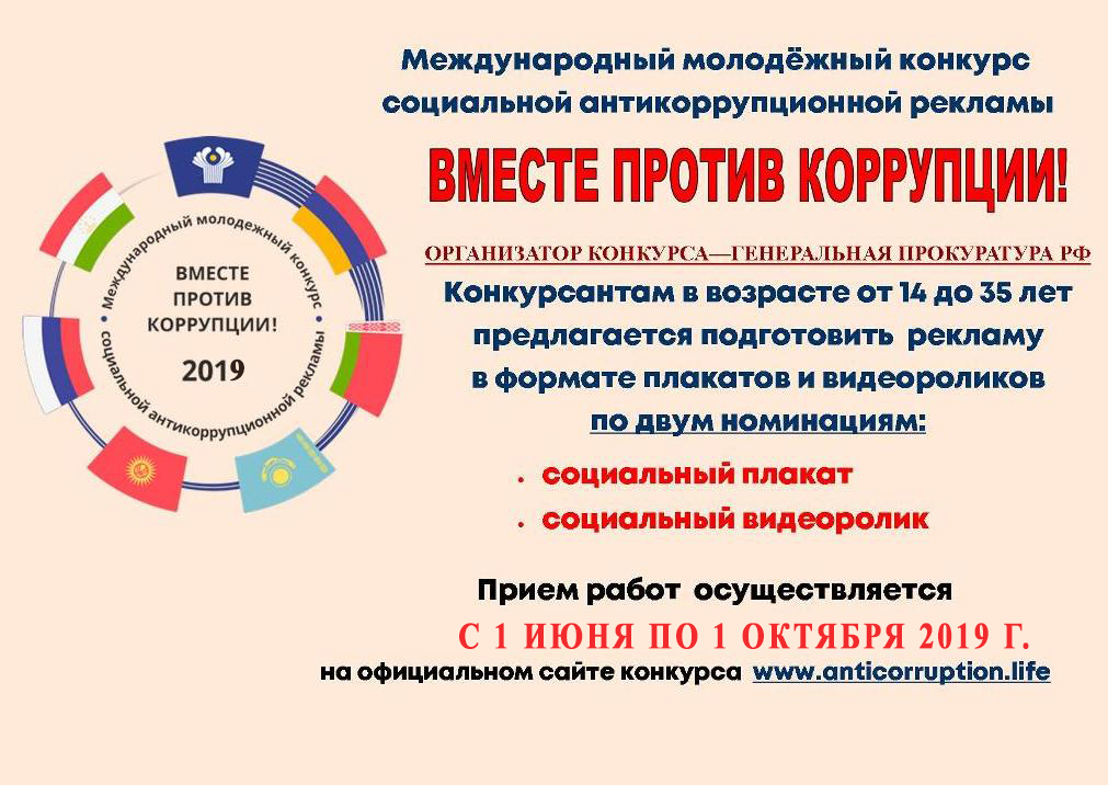 Генеральной прокуратурой Российской Федерации организован Международный молодежный конкурс социальной антикоррупционной рекламы «Вместе против коррупции!».Соорганизаторами этого конкурса выступают соответствующие компетентные в области противодействия коррупции органы государств – участников Международного совета по противодействию коррупции и стран БРИКС.