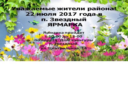 Ярмарка пройдет 22 июля с 10-00 до 13-00 в п. Звездный, на площади возле Дома культуры, по адресу: ул. Центральная, 14.