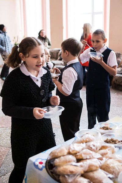 Перед началом мероприятия все желающие смогли согреться бесплатным горячим чаем с выпечкой и гречневой кашей с мясом.