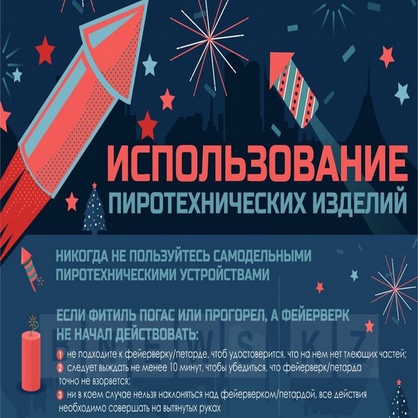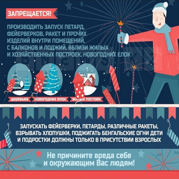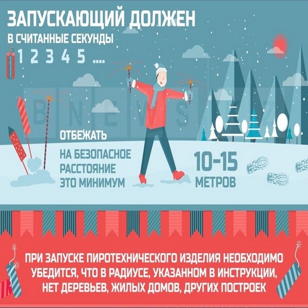 Запрещается направлять фейерверки на людей, животных, строения, а также применять изделия при сильном ветре, ближе 30 метров от строений, деревьев, легковоспламеняющихся предметов, а также изделия с признаками разрушения. Не оставляйте в новогоднюю ночь форточку и балконную дверь открытыми - залетевшая петарда может стать причиной пожара.
